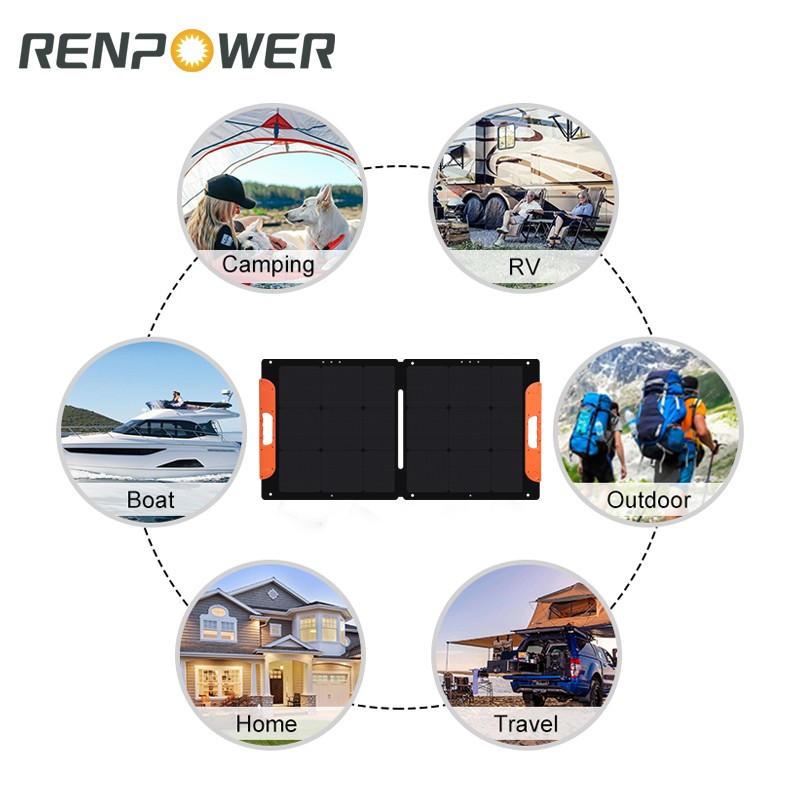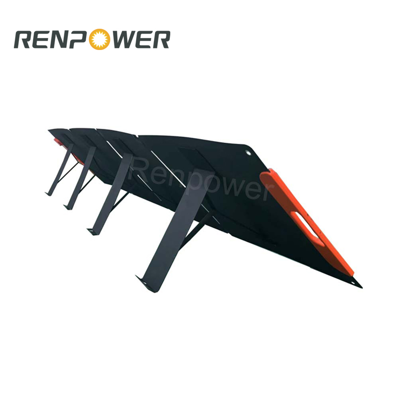 4. Sammenleggbart og bærbart - Dette 100w bærbare sammenleggbare solteppet kan brettes som en koffert, og alt tilbehør kan lagres i det, kan du løfte det hvor som helst. Designet med kickstands, som kan brukes til å støtte solcellepanelet og justere vinkelen.
